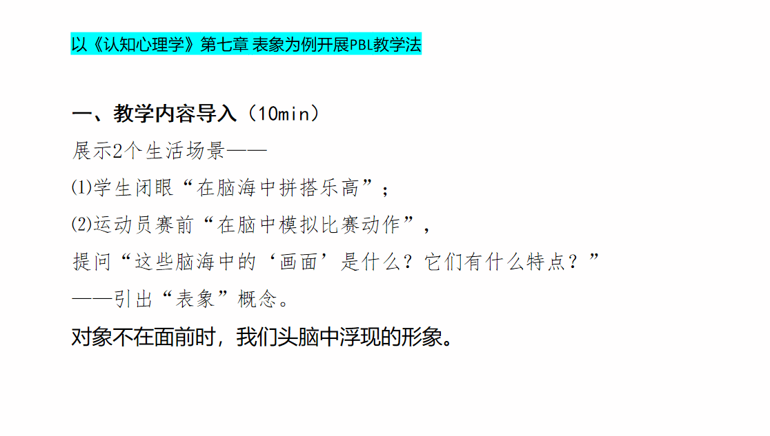 主讲教师开篇以在脑中模拟“拼乐高”“比赛中的动作”两个生活场景展示中导入教学内容,引出“表象”概念——对象不在面前时,我们头脑中浮现的形象。进入正题后从三阶段介绍如何开展PBL教学法:1.讲解表象概念,辅以案例阐释其特征(直观性、概括性和可操作性)阶段;2.分组与任务分配阶段:4-5人成一组,各组领取议题,研讨并细分为“搜集生活,表象应用之实例”等三个子任务,各组分别明确实验设计、案例搜集、记录整理、成果汇报等各自的分工;3.小组探究与实验设计阶段:小组研讨、方案完善和案例收集。