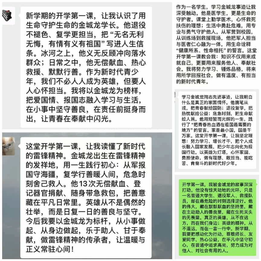 本次开学第一课以主题班会为主,班级围绕金城龙的事迹展开深入交流。同学们重温金城龙与雷锋跨越时空的“日记对话”,从“无名无利无悔,有情有义有祖国”的赤诚誓言,到“师出之日,有死之荣,无生之愿”的使命担当,同学们结合自身学习生活分享感悟,在思想碰撞中读懂榜样的精神内核,树立向楷模看齐的成长目标。